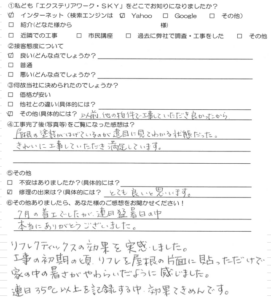 →7月の着工でしたが、連日猛暑日の中、本当にありがとうございました。リフレクティックスの効果を実感しました。工事の初期の頃、リフレを屋根の片面に貼っただけで家の中の暑さがやわらいだように感じました。連日35℃以上を記録する中、効果てきめんです。