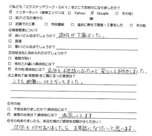 きれいに仕上げていただき安心して生活できるようになりました。ありがとうございます。