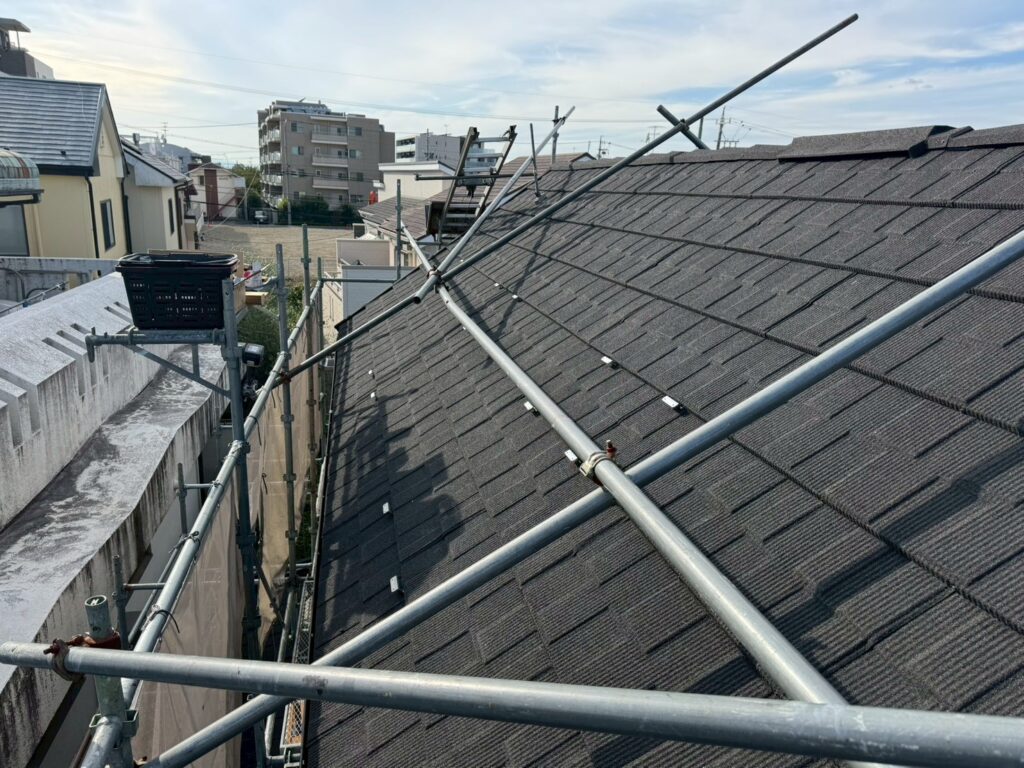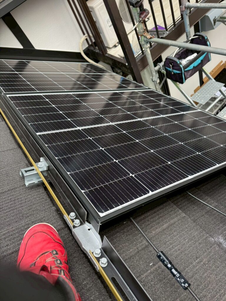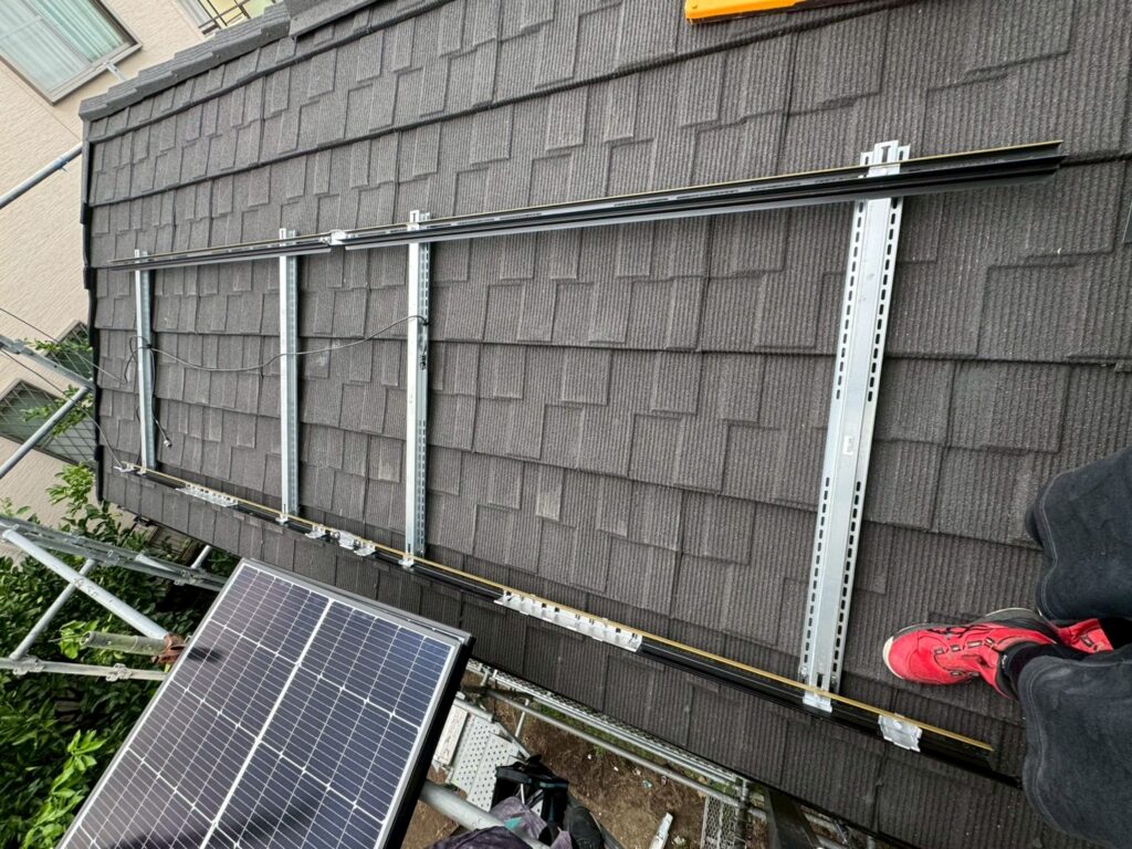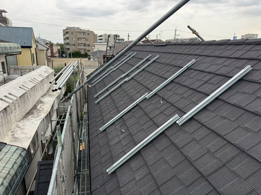 名東区の太陽光発電工事本日着工です。 よろしくお願いいたします。 大屋根の太陽光パネルを取付ける面に専用架台を取付けます。