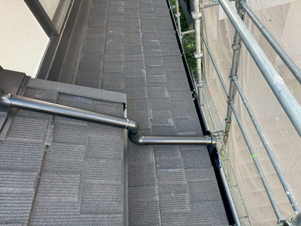 エルボを使って軸道を変えながら下屋の軒樋に繋げます。