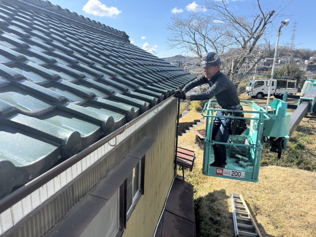 既設の軒樋を撤去し、金具と軒樋を新設しました。 今回は高所作業車で作業を行いました。